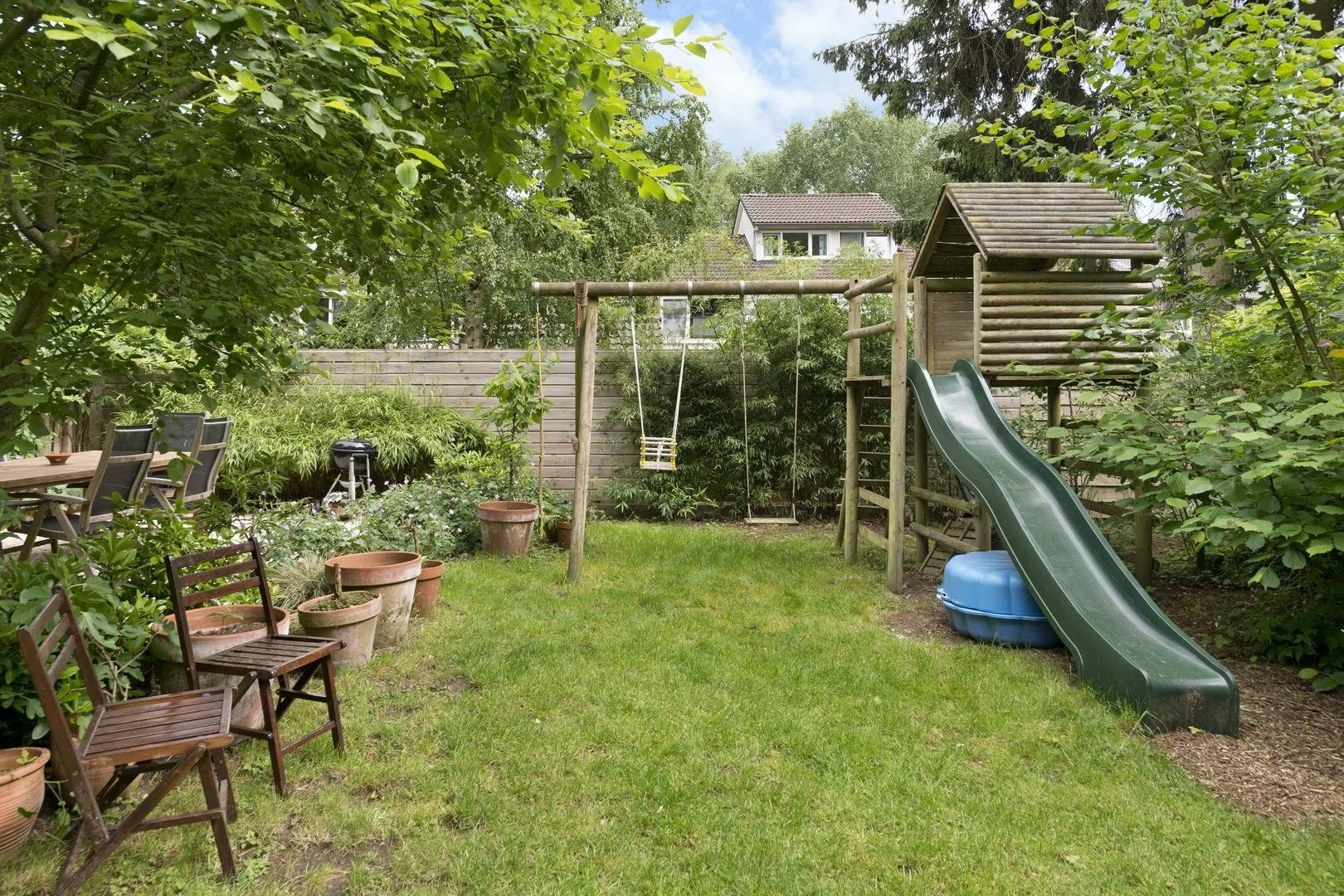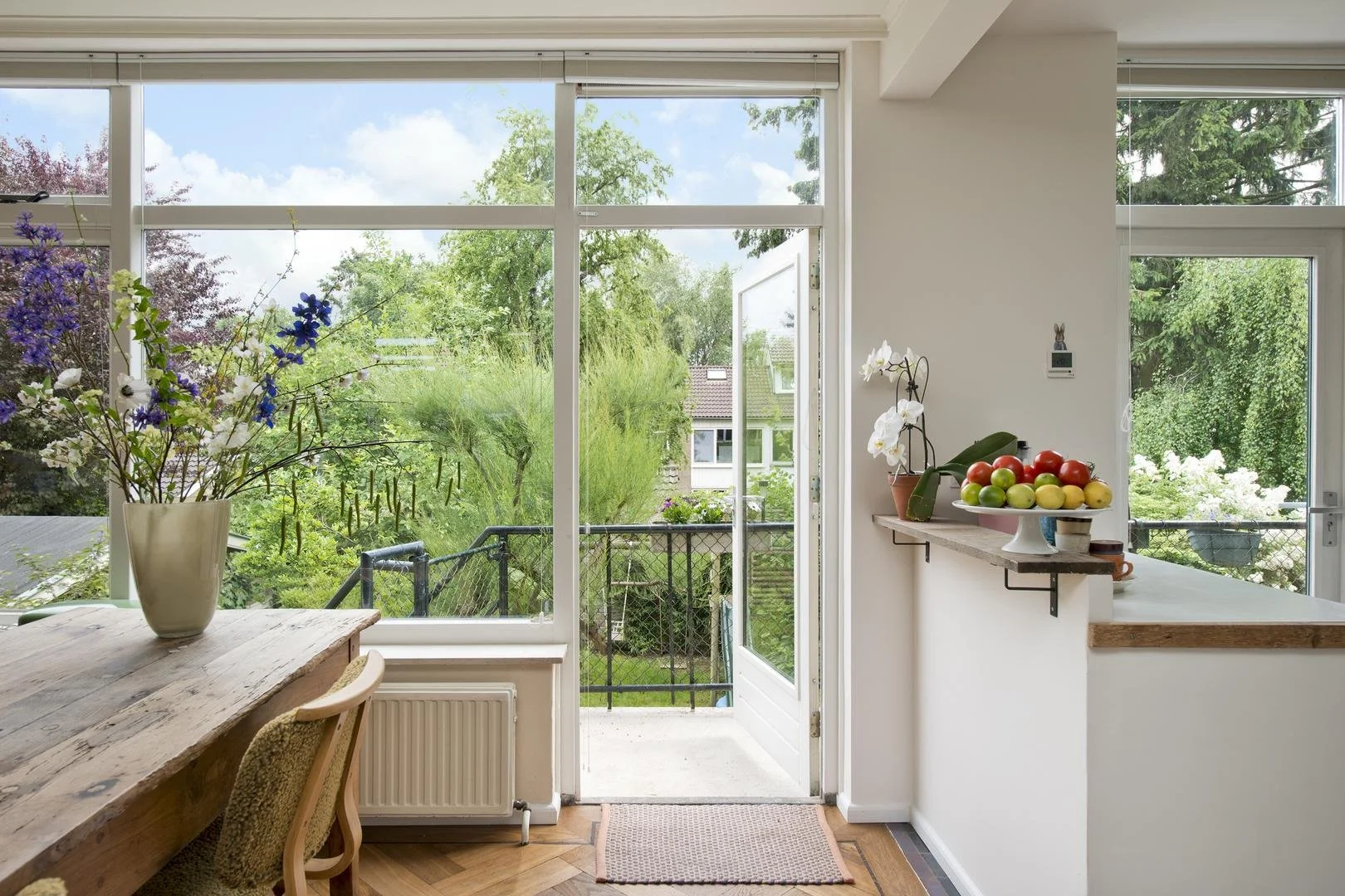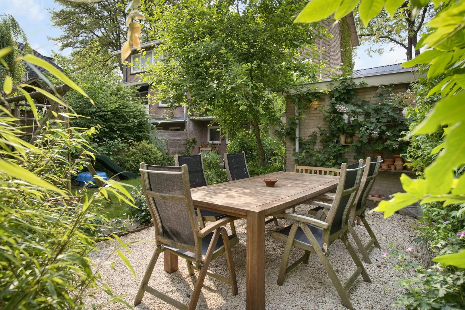 Wat het huis bijzonder maakt is de indeling. Je komt binnen op de middelste verdieping waar de woonkamer en keuken zijn, loopt aan de achterkant naar buiten op een balkon, en neemt dan de trap naar de tuin. Die tuin heeft flink wat werk gekost. Er stonden lariksen van 30 meter die over de erfgrens gegroeid waren en alles donker maakten. Plus een permanente laag naalden overal. Ze zijn uiteindelijk over het huis heen getakeld – best spectaculair om te zien.