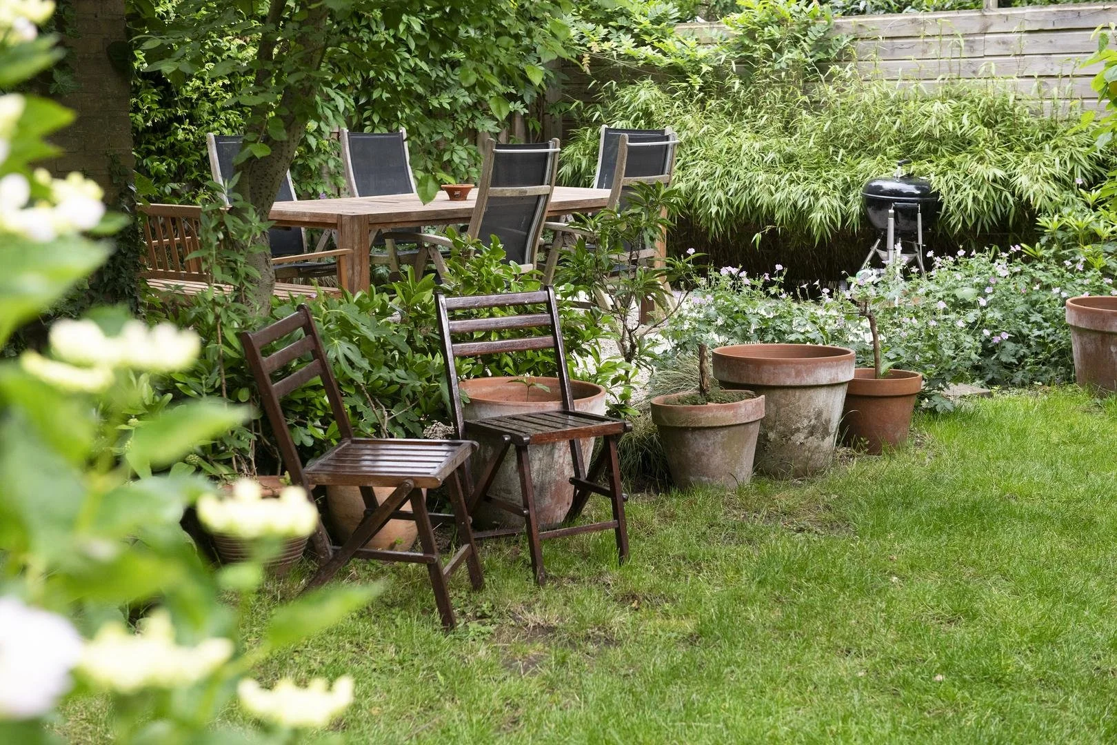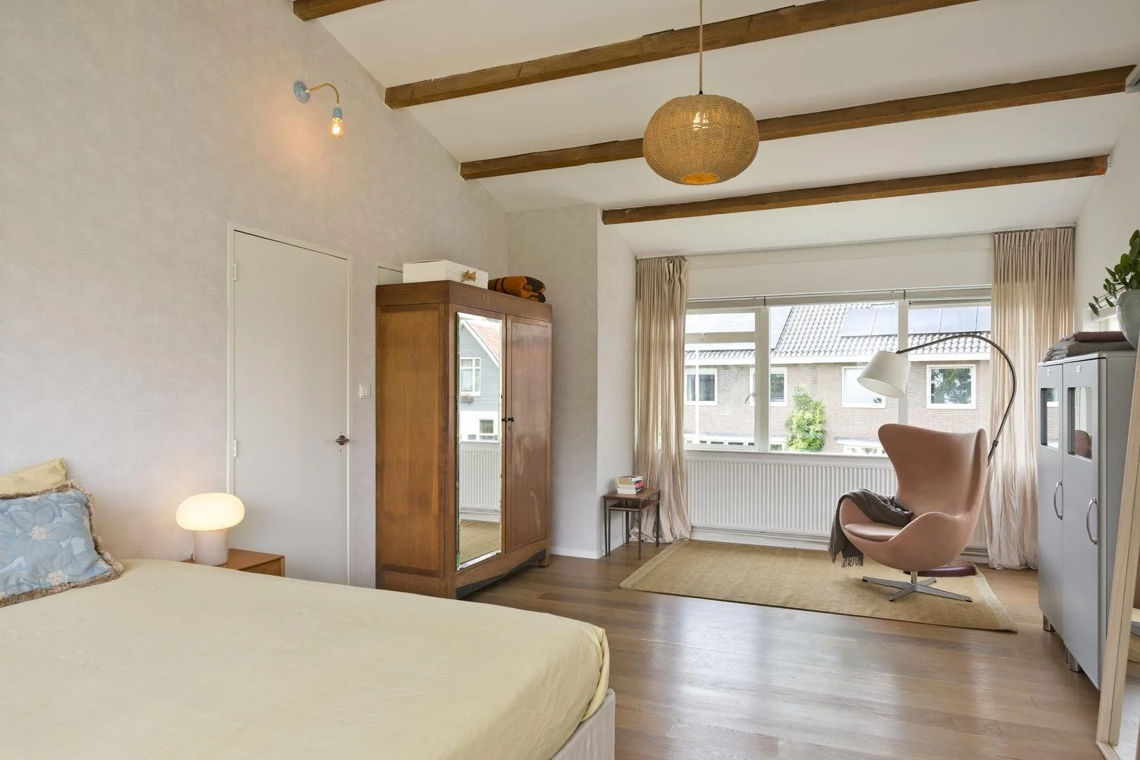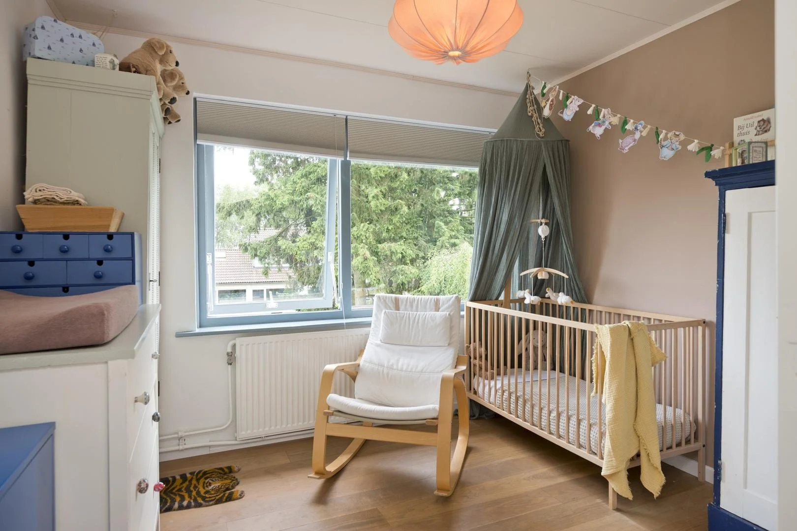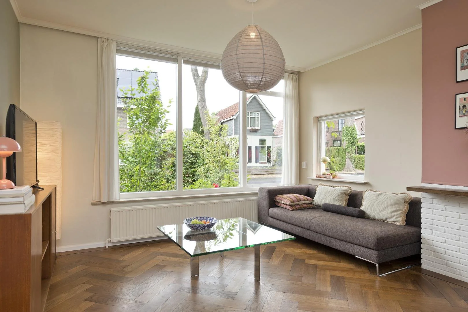 Wat het huis bijzonder maakt is de indeling. Je komt binnen op de middelste verdieping waar de woonkamer en keuken zijn, loopt aan de achterkant naar buiten op een balkon, en neemt dan de trap naar de tuin. Die tuin heeft flink wat werk gekost. Er stonden lariksen van 30 meter die over de erfgrens gegroeid waren en alles donker maakten. Plus een permanente laag naalden overal. Ze zijn uiteindelijk over het huis heen getakeld – best spectaculair om te zien.
