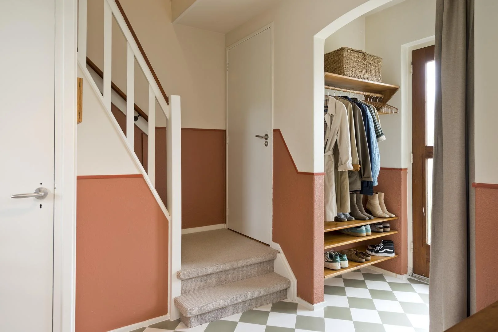 De sfeer die we zochten: warm, mediterraans, en een knipoog naar de jaren 60. Duurzame materialen waren belangrijk. In de woonkamer ligt verouderde eiken visgraat, in de keuken en badkamer Marokkaanse zelliges, in de gang Portugese cementtegels, en op de trap zuivere wol.